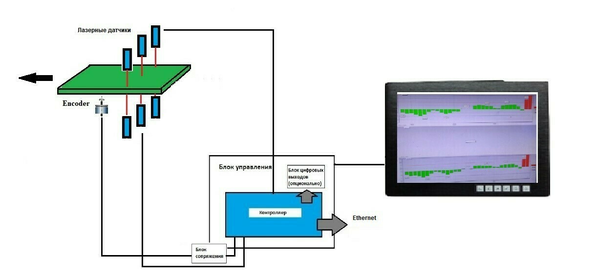 Обработанные результаты измерений передаются во внешнюю систему управления, для автоматической сортировки плиты.